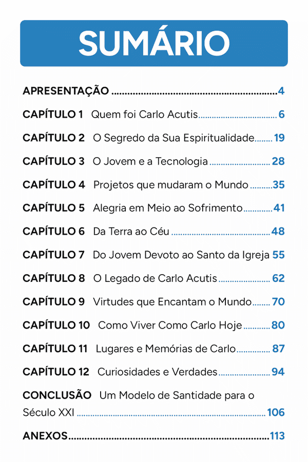 Neste eBook inspirador, você vai mergulhar na história completa do “Santo da Internet”, desde sua infância até a canonização. Vai conhecer o segredo de sua espiritualidade simples e profunda, seus projetos digitais que impactaram o mundo, sua coragem diante da doença e a luz que continua brilhando através do seu legado.