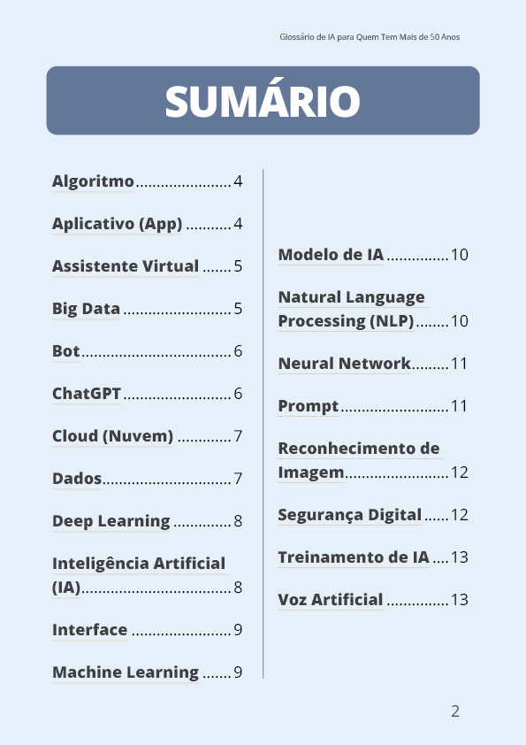 Este glossário é como um tradutor entre você e a tecnologia moderna. Ele mostra que a Inteligência Artificial pode ser compreendida por qualquer pessoa — inclusive por quem nunca teve contato com esse universo. E o melhor: você aprende com exemplos reais, dicas úteis e linguagem acessível.
