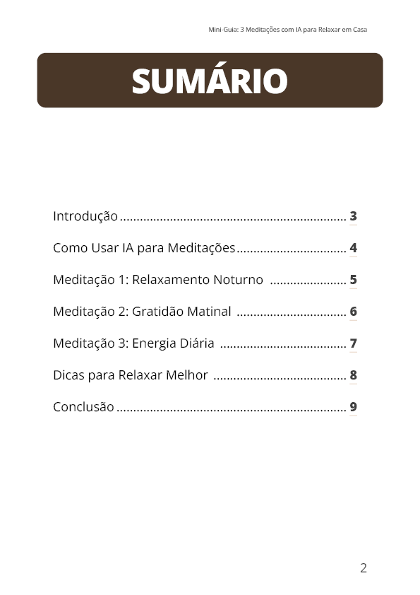 Apresentamos o exclusivo “Mini-Guia: 3 Meditações com IA para Relaxar em Casa”, criado para ajudar você a desacelerar, dormir melhor e começar o dia com mais energia — tudo com a ajuda da Inteligência Artificial, de forma leve, prática e acolhedora.
